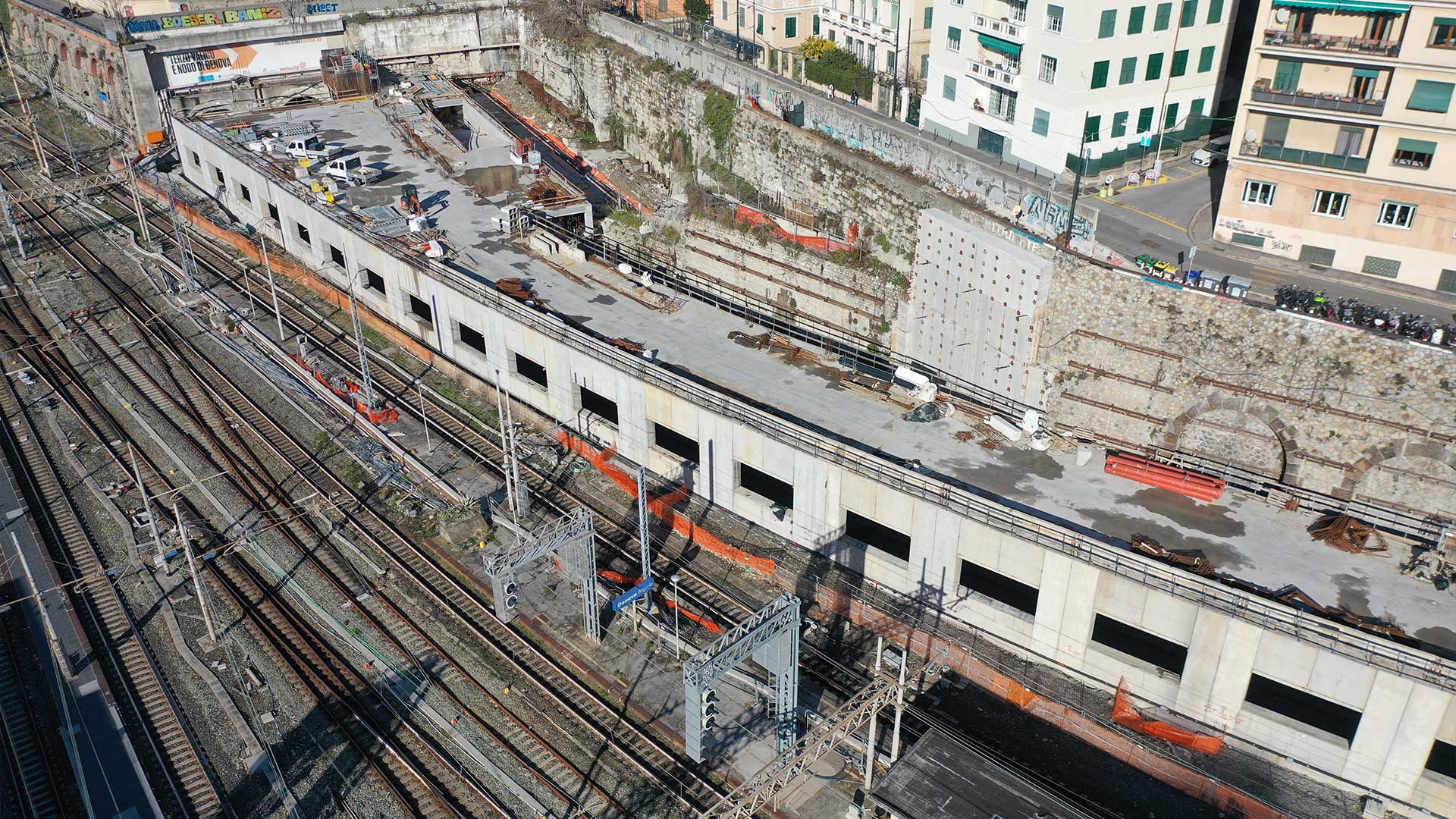 - Galleria artificiale: Completato il corpo 2, completata la posa delle travi prefabbricate del Corpo 1 del Binario Colombo, in fase di ultimazione l’ultimo tratto di getto di completamento della soletta di copertura;