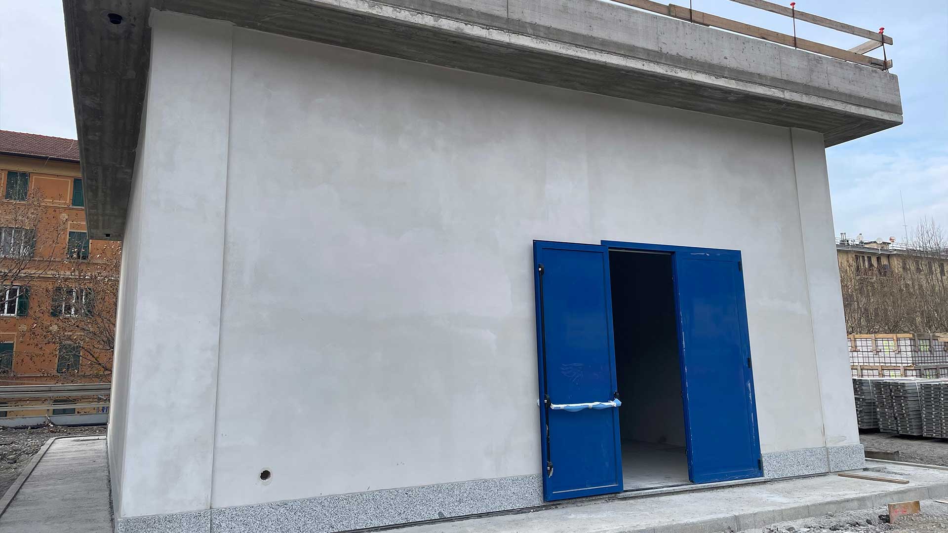 - FABBRICATO ANTINCENDIO: l’opera ha dimensioni di 12,50m x 9m ed è suddiviso internamente in una vasca antincendio e in un locale centrale antincendio. Ha lo scopo di raccogliere le acque antincendio e rilanciarle, tramite una stazione di pompaggio, ove necessario lungo il parco ferroviario;